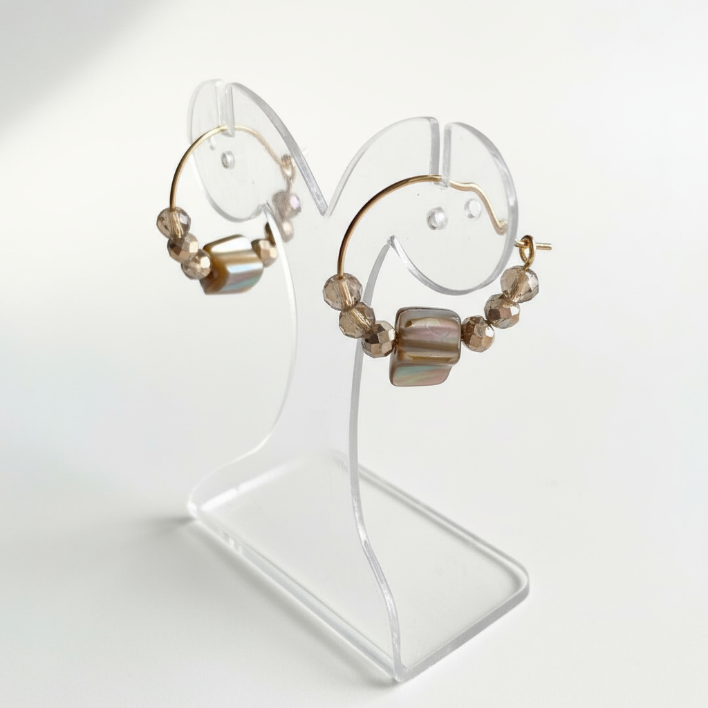 18k Gold plated, brass hoops with Erose shell and Glass. Each Earring measures 23x22mm and weighs 0.09oz