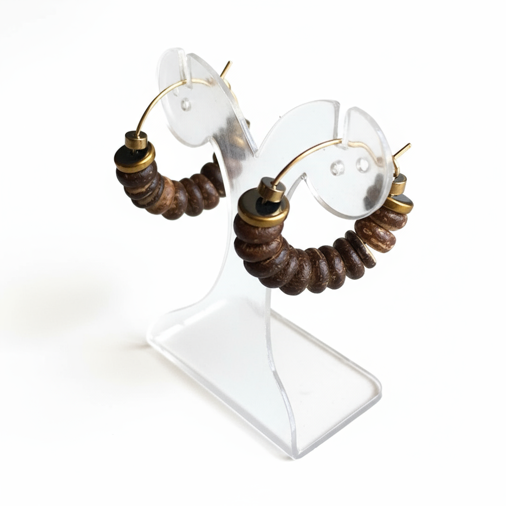 CSTE04 - Hematite & Coconut hoop earrings - Brown, wood