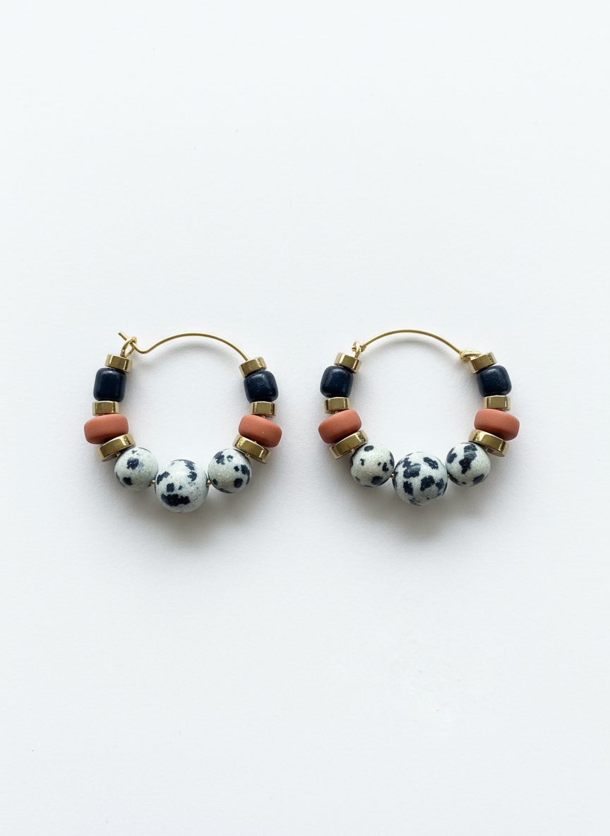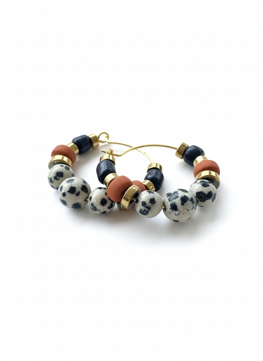 BDLHE02 - Dalmatian Jasper & Sandstone barrel Hoop Earrings