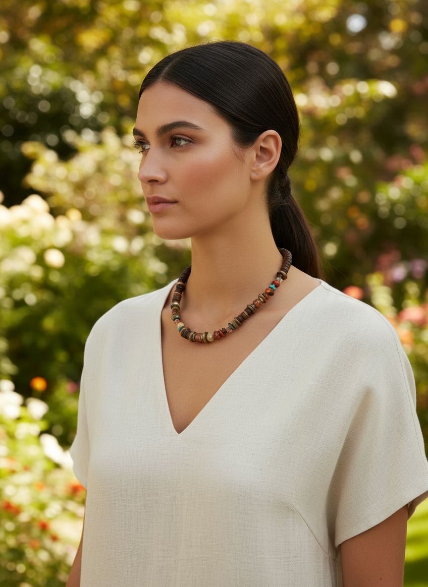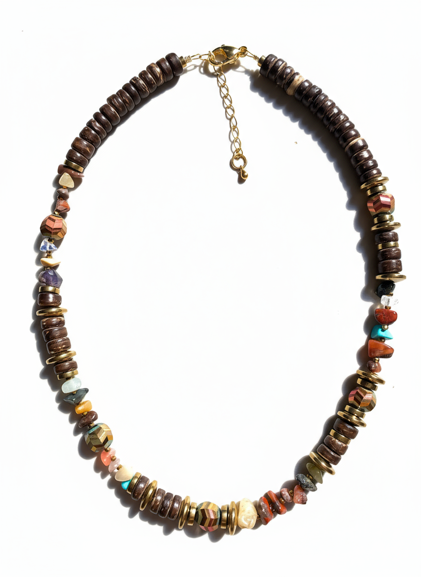 18" necklace with, slices of Coconut, Gold plated hematite, mixed semi precious stone chips, Gold plated crystals.