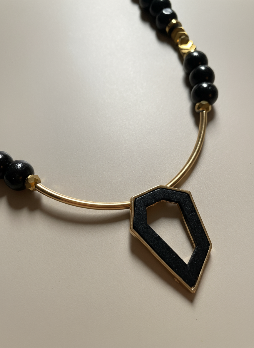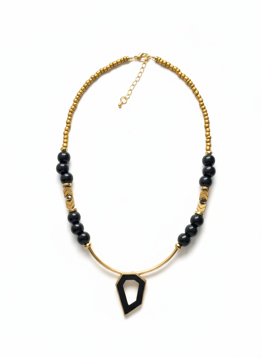 FRT10 - Seed bead, painted wood, crystal, gold plated bars and Hematite necklace