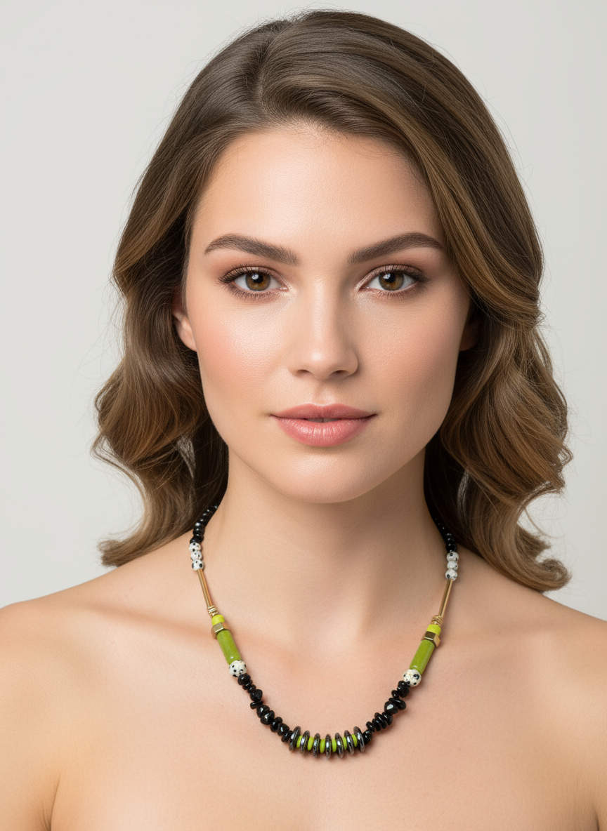 18" necklace made up with Dalmation jasper, clay, hematite, acrylic, clay and Obsidian gem stones
