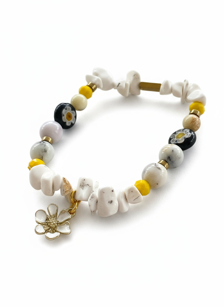 HILB15 - White chip and black glass flower Bracelet